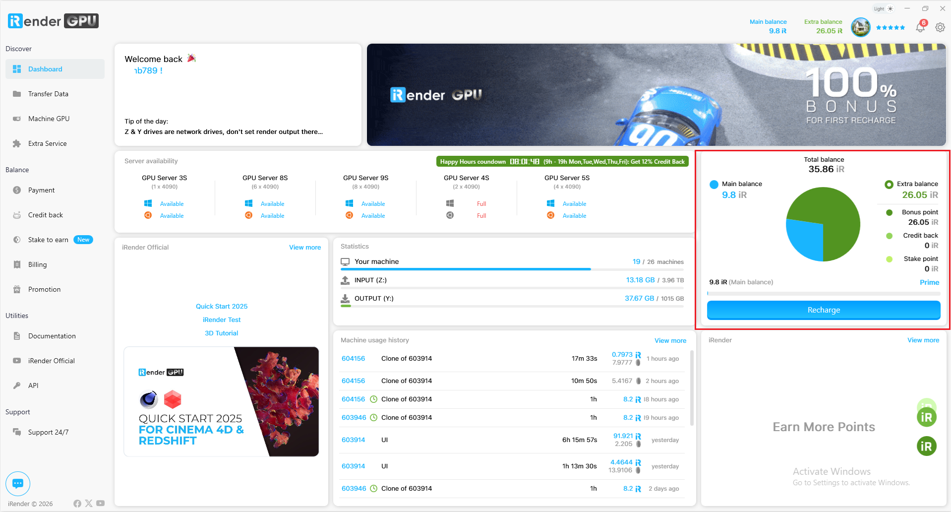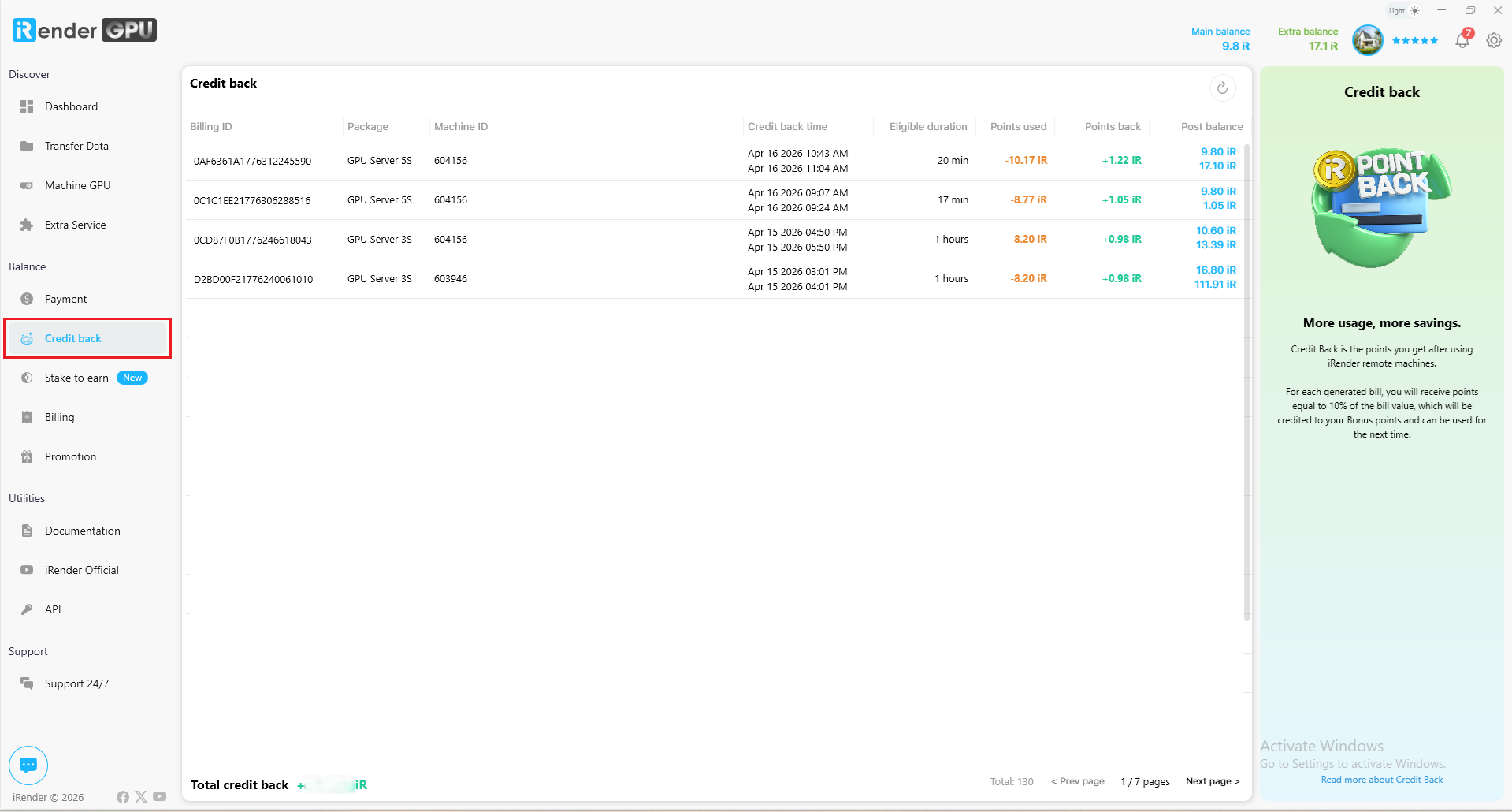 With this system, users can earn from 10% to 20% of the credits they spend, depending on the time they use the service. This means your actual cost becomes lower over time, especially if you use iRender regularly.