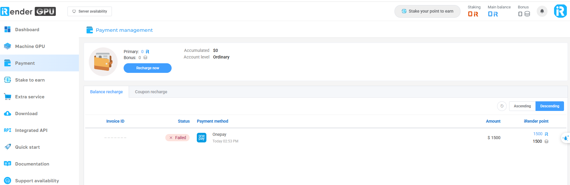 Log in to your iRender account and choose Payment > Recharge now.